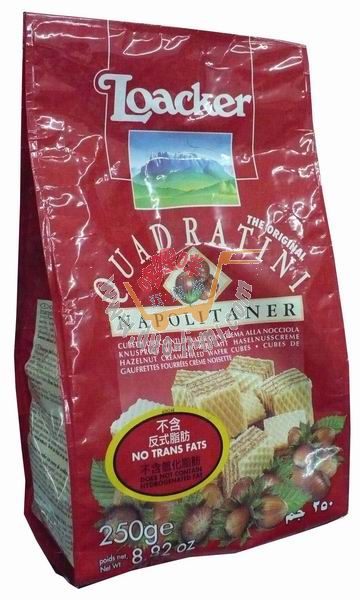品 名:萊家粒粒袋裝威化餅(榛子味)/250克(165) 進口食品批發(fā)